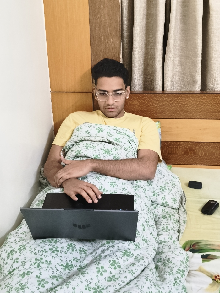 The image displays a young male individual, appearing to be of South Asian descent, seated upright in a bed within an indoor residential setting. He is wearing a yellow short-sleeved t-shirt and clear-framed eyeglasses. A white duvet with a green floral pattern covers his lower body and lap. A dark grey laptop, identified by an ASUS TUF logo, is open and resting on the duvet in front of him. His right hand is placed over his left forearm, which is positioned across the laptop's base. The background features light-colored wooden paneling on the left and a darker, textured wooden headboard behind the individual. Light beige pleated curtains are visible in the upper right portion of the image. On the yellow-colored bedsheet to the individual's right, a black wireless earbud case and another black electronic device are present. No specific visual cues within the image definitively establish its precise location within the city of Kolkata, India; the scene is characteristic of a generic indoor bedroom.