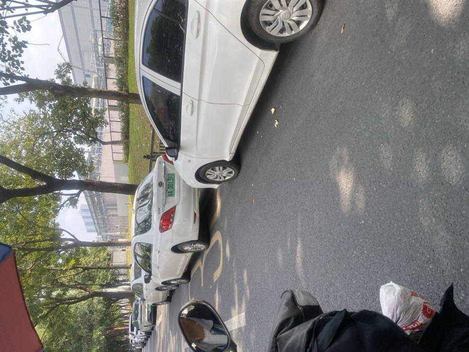 A row of parked white cars lines a street shaded by trees. The camera seems to be positioned on a vehicle, showing parts of the rider's legs and some gear in the foreground. The cars are parked along the right side of the road, with buildings and industrial structures visible in the background through the trees. A license plate is visible on one of the cars.