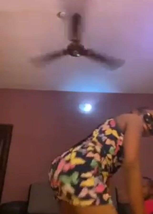 A young, dark-skinned woman dances in a room. She wears a black and multicolored butterfly-patterned shorts and top outfit and dark sunglasses. The room has light purple walls, and a ceiling fan is running. There is a dark-colored couch on the left and a framed picture. The woman turns towards and away from the camera, twerking.