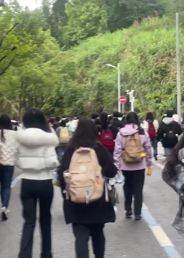 A group of people are walking on a paved road lined with green foliage. The camera follows from behind, capturing mostly the backs of the pedestrians. They are dressed in various outerwear and carrying bags, suggesting they may be students or commuters. The environment appears slightly damp, possibly after or during light rain. The road has a blue painted lane marker. The overall scene conveys a sense of everyday activity, possibly students heading to class.