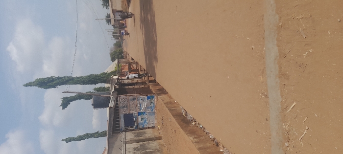 This image depicts a street scene in the city of Toto, Nigeria, under a partly cloudy sky. The primary feature is an unpaved, reddish-brown road extending into the distance from the lower center of the frame. On the left side of the road, a concrete drainage channel runs parallel, containing some debris. Beyond this channel, a low concrete wall and a series of single-story structures are visible. One structure features a blue and white patterned metal gate, possibly a shop or residence entrance. A black water tank is mounted on the roof of an adjacent building. One male individual, dressed in a light-colored shirt and trousers, stands on the dirt shoulder near these structures, facing generally towards the road. Behind the buildings, three tall, slender, dark green columnar trees rise prominently against the sky. Overhead power lines or communication cables are strung across the upper mid-ground. On the right side, the unpaved road continues, flanked by low-rise buildings that recede into the background. In the mid-distance on the road, two indistinct figures are visible operating motorcycles, traveling away from the viewer. The immediate foreground shows a rough, reddish-brown earthen surface with scattered small debris. The sky is light blue with white cumulus clouds.