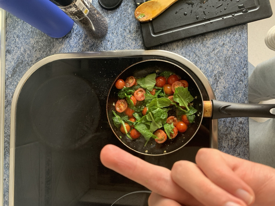 An overhead view captures a kitchen scene focused on food preparation. A black frying pan, positioned on a black ceramic-glass induction cooktop, contains halved red cherry tomatoes and fresh green spinach leaves. A light-skinned human hand is visible in the lower-left foreground, with the index finger extended vertically towards the upper left portion of the frame. The cooktop is integrated into a blue and white speckled countertop. To the upper right, a dark blue insulated bottle stands next to a clear black spice grinder filled with peppercorns. A black rectangular cutting board with residual moisture and a wooden spoon bearing green organic matter are also visible on the countertop to the right of the stovetop. The lower legs and feet of an individual, wearing light grey athletic pants and white socks or footwear, are partially visible below the counter, implying a standing posture during the activity. The image contains no identifiable features to specify the location as Madrid, Spain.