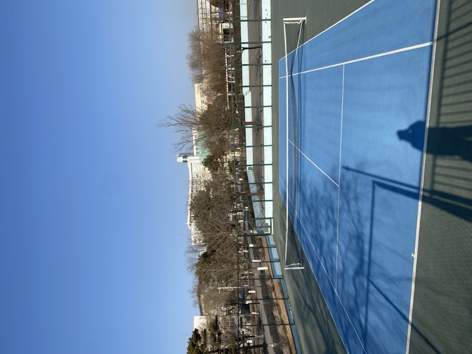 A vibrant blue tennis court occupies the right side of the frame, complete with white lines and a net. The court's surface is marked by the long shadows of a person and a fence. To the left, bare trees line a pathway, leading towards a distant cityscape with tall buildings under a clear blue sky. The overall composition showcases a stark contrast between the man-made structure and the natural environment.