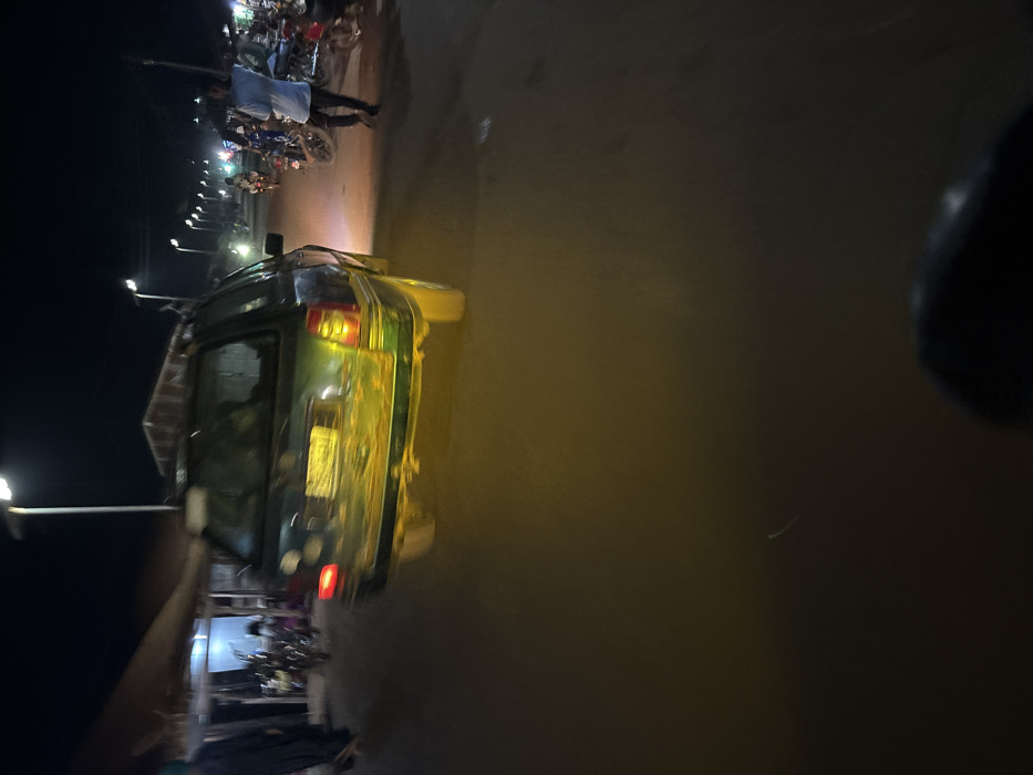 A green van sits on a street at night. The van is illuminated by streetlights and its own taillights. The street appears to be populated with people and motorcycles. The background is dark, with more streetlights visible in the distance. The image is rotated and includes a blurred object in the right corner.