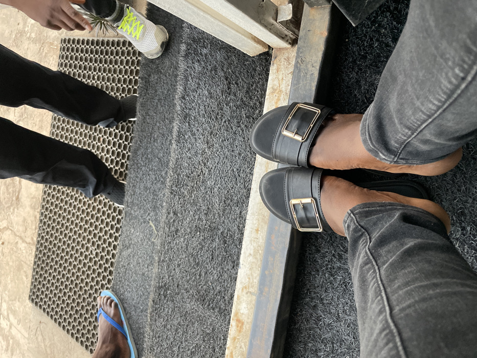 This image captures a low-angle, top-down view of multiple individuals' feet and legs positioned at an entrance within the city of Jos, Nigeria