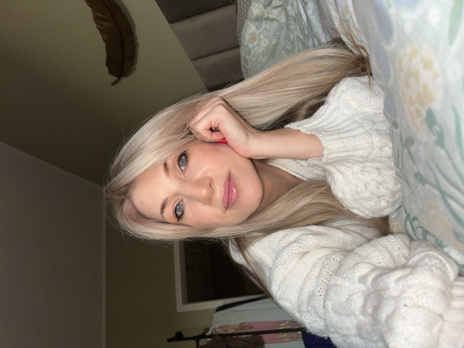 An adult female is depicted in a medium close-up, lying prone on a bed, propped on her forearms. She has long, straight blonde hair with visible roots, styled over her shoulders. Her eyes are blue, accentuated with dark eyeliner, and her lips are full with a light pink, glossy finish. She wears a cream-colored, cable-knit sweater featuring puffed sleeves and ribbed cuffs. Her left hand, with red-painted fingernails, rests beneath her chin. The bed is covered by a duvet with a light floral pattern in blue, green, and yellow hues on a pale background. In the background, a muted olive-green wall is visible. To the upper left, a dark metal garment rack with indistinct clothing items is partially visible. To the upper right, a large, textured, golden-brown decorative object resembling a feather is mounted on the wall. A grey upholstered headboard is partially visible behind her head. The scene is set indoors, within what appears to be a bedroom. The image contains no discernible landmarks or unique identifiers to determine its specific location within the city of Berlin, Germany.