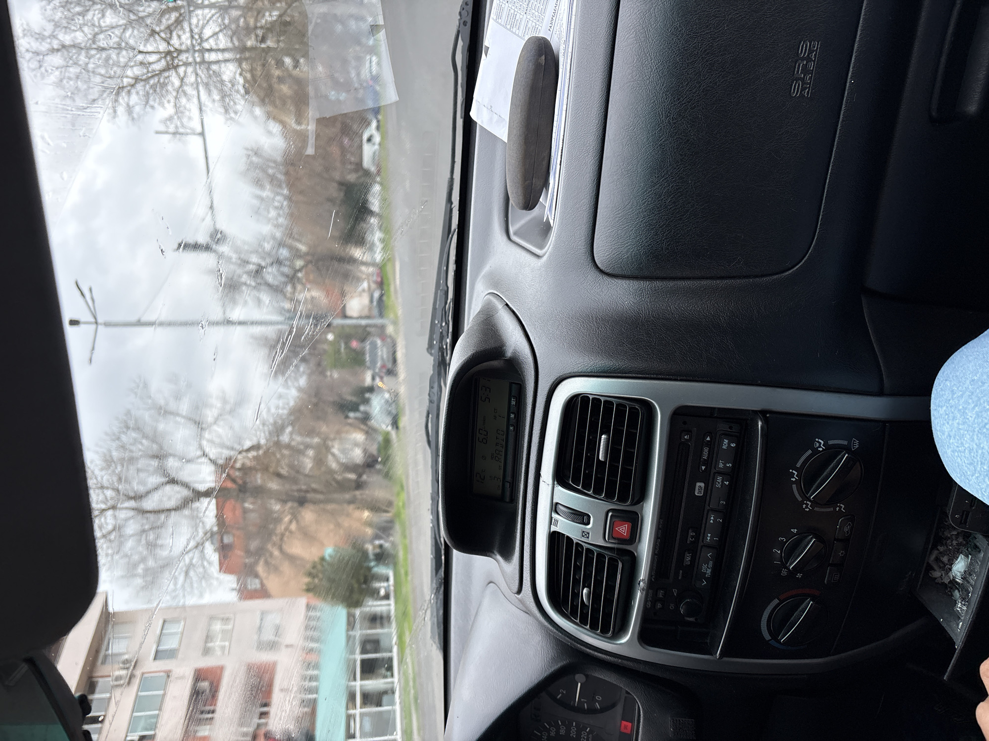 The image displays an interior view from a vehicle's front passenger seat, looking forward through the windshield onto an urban street in Plovdiv, Bulgaria. The vehicle's dashboard is black and textured, with a prominent center console. An overhead digital display indicates an external temperature of "12 C", a time of "5:31", and "RADIO 1" as the active station. Below this, two central air vents are visible, separated by an illuminated red hazard warning light button. Further down are three rotary climate control dials and a car radio/CD player unit with "MITSUBISHI" branding. A partial view of the driver's side instrument cluster shows a speedometer and an illuminated red warning light. Below the climate controls, a small open compartment contains scattered debris. A hand with a light skin tone is partially visible near this compartment. On the passenger side, the dashboard features "SRS AIR BAG" embossed into the material, and a dark, oval-shaped glasses case rests on top of white documents in a shallow dashboard recess. The bottom right corner shows light blue fabric, consistent with a person's leg or clothing. The windshield is significantly streaked with water and exhibits multiple cracks and scratches, partially obscuring the exterior view. Beyond the windshield, an urban street scene unfolds under an overcast sky. To the left, a multi-story, light-colored apartment building with numerous windows and balconies is visible, featuring several external air conditioning units. The ground floor of this building includes a commercial space with large glass windows and a teal-colored awning or facade. Bare-branched deciduous trees line the street, indicating a non-summer season. A tall street light pole is present on the left side of the road, and a traffic light structure is visible further in the distance. Several other vehicles, including a white van, are discernible on the street. No distinct human figures are clearly visible outside the vehicle.
