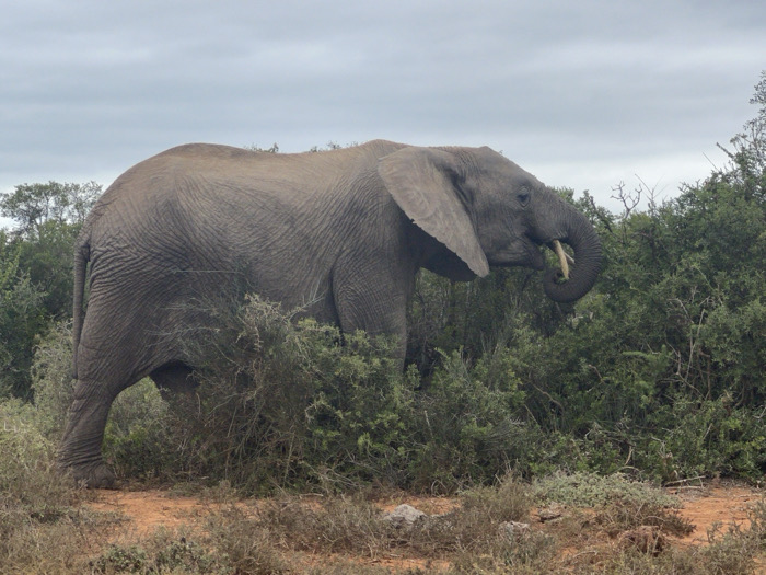 An adult African elephant stands facing right amidst dense green scrub and brush, situated on reddish-brown earth. The elephant, observed from its left side, has its trunk raised and appears to be feeding, with a light-colored piece of vegetation visible at its mouth/trunk tip. Its large, wrinkled grey hide is partially concealed by the surrounding foliage, which extends across the midground. The foreground consists of sparse dry vegetation and exposed reddish-brown soil. The background shows more dense green trees under an overcast grey sky. This scene is located within the Sundays River Valley Local Municipality, South Africa.