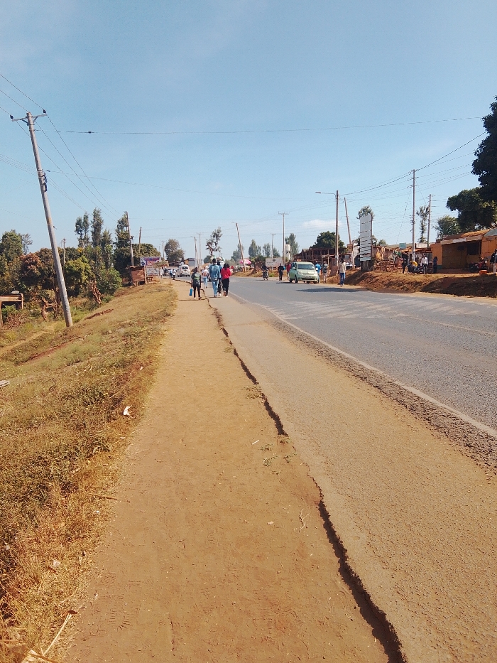 A sunny day shows a road with a cracked edge next to a dirt shoulder. A group of people walks along the road's edge. Across the road, buildings line the side, suggesting a small town or village. Power lines run parallel to the road on the left, supported by wooden poles. A light blue sky stretches above, almost cloudless. A green car is moving down the road.