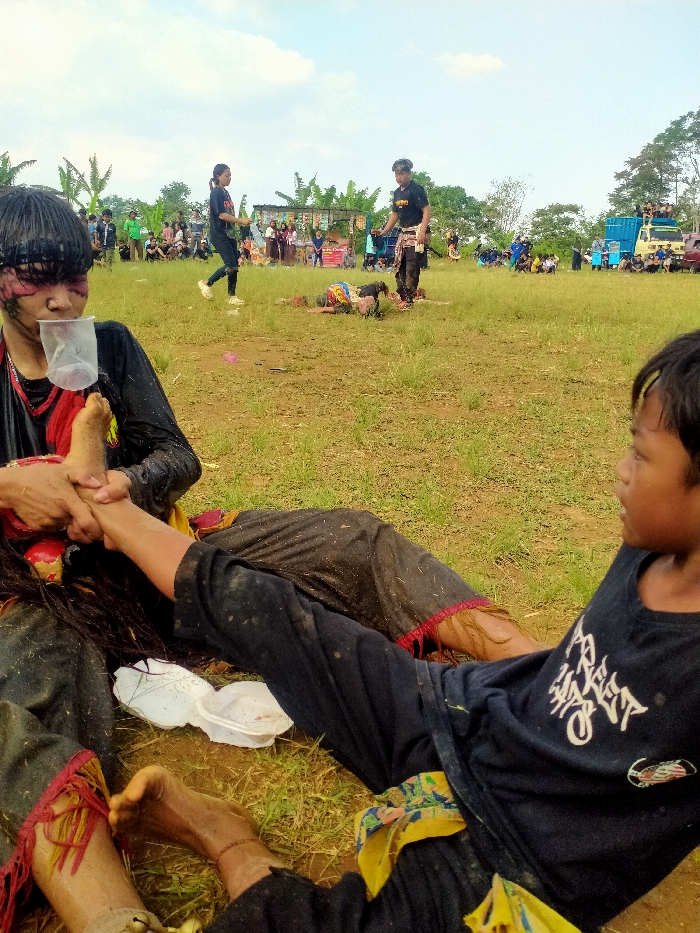 This outdoor image, captured in Sidomukti, Indonesia, depicts a cultural event on a grassy field with patches of exposed dirt and mud under a partly cloudy sky. In the immediate foreground, to the left, a person with long dark hair, facial markings (red and black around the eyes), and wearing a black long-sleeved garment with red and black fringes, holds a clear plastic cup to their mouth. Their left hand grips the right ankle of another individual whose legs are visible, lying on the ground. This person wears dark, muddy trousers with red and yellow fringed cuffs; their bare feet are also visible. A crumpled white Styrofoam container rests on the ground between them. To the right in the foreground, a young boy, wearing a black T-shirt with white text and dark trousers, is seated on the ground with a yellow patterned cloth around his waist, looking towards the right side of the frame. In the midground, a person in a black shirt and dark pants walks left. Further right, another individual, dressed in a black shirt, dark pants with a patterned sash, and a headband, stands over a prone figure lying face down on the muddy ground. This prone figure wears multi-colored patterned clothing. In the background, a crowd of spectators is gathered along the perimeter of the field, some standing, some seated. To the far left, a makeshift stall with a green tarp roof is visible. To the right, a blue utility truck is parked, with several individuals sitting on its roof and bed. Lush green trees and foliage line the horizon.