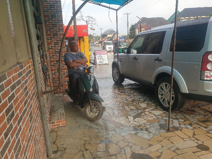 The scene depicts a street in Umuode, Nigeria, characterized by an overcast sky and wet ground. In the immediate foreground, to the left, is a brick building constructed with reddish-brown and dark-colored bricks. A metal pipe structure runs vertically along this wall and then curves horizontally. An adult male, with a dark complexion and short hair, is seated on a dark-colored motor scooter, facing away from the camera's direct line of sight but looking towards the right side of the frame. He is wearing a blue t-shirt and dark trousers, with his arms crossed over his chest. The scooter is positioned on a paved surface composed of irregular, multi-colored tiles (tans, grays, browns), which is visibly wet with puddles and reflections. To the right of the man and scooter, a silver Land Rover Discovery 4 SUV is parked. The vehicle's left side and rear are visible, showcasing alloy wheels and tinted windows. This SUV is also situated on the wet, tiled pavement. Overhead, a blue canopy is supported by several slender metal poles, one of which stands between the man on the scooter and the SUV. In the midground and background, a paved road stretches into the distance, with additional vehicles, including a white van, and various buildings lining the street. Some background structures feature red and yellow elements, suggesting commercial establishments. Utility poles and overhead wires are visible, along with a tree with sparse foliage further down the street. A partially obscured, faded sign with dark lettering is also visible in the background.