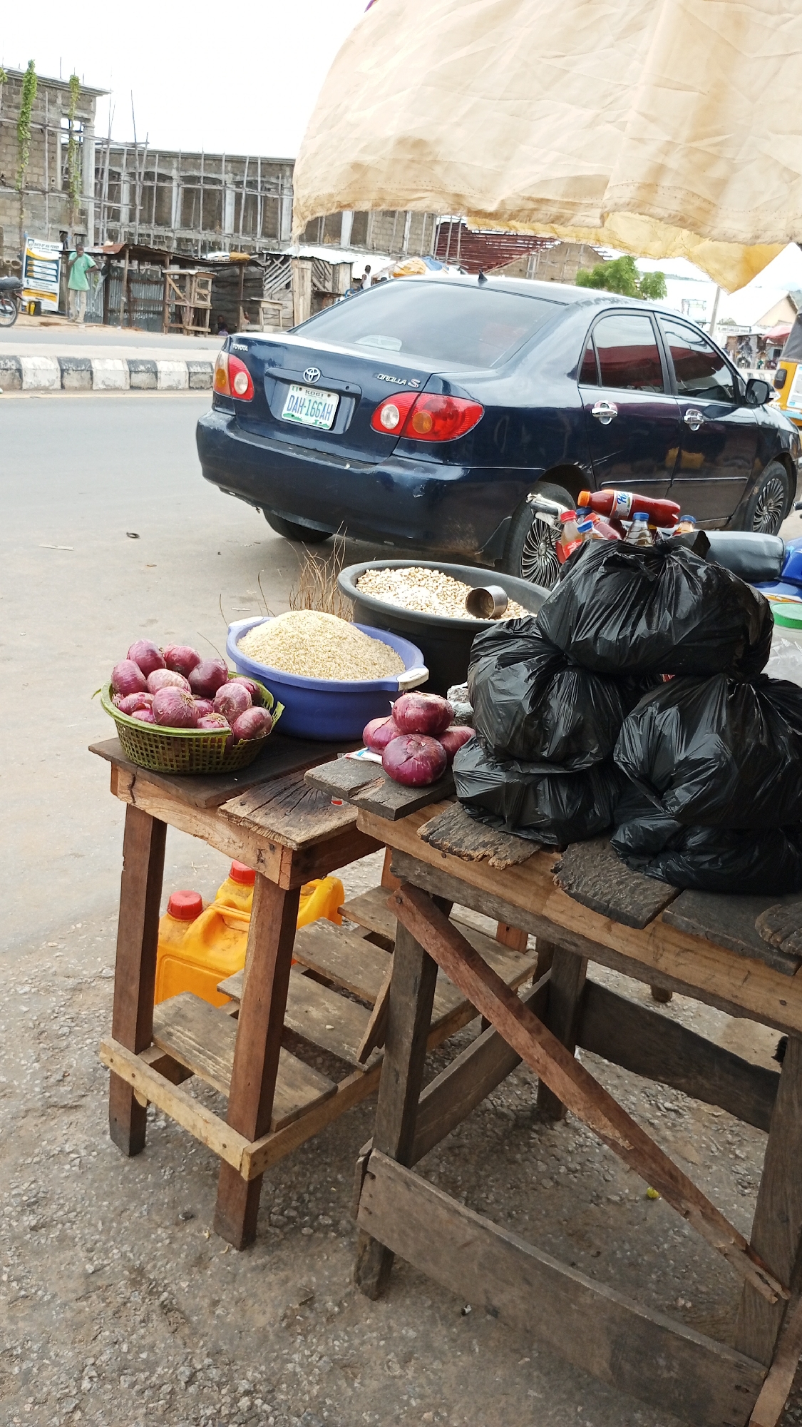 A roadside market stall in Zango-ndaji, Nigeria, displays a variety of food items