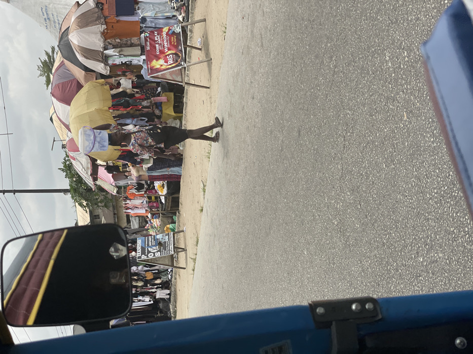 - "The image depicts an outdoor market scene in Yenegoa, Nigeria, viewed from the interior of a blue vehicle, likely a tricycle, with a side mirror visible in the upper left reflecting a red and yellow striped object" by FM-M6Vor1, licensed under CC BY 4.0