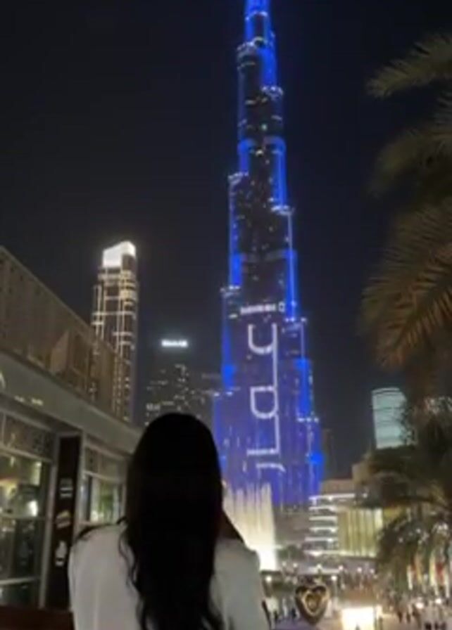 A woman with long black hair, wearing a white jacket, stands on a balcony overlooking a nighttime cityscape. The prominent feature of the scene is the Burj Khalifa, illuminated in blue, displaying the word "EMAAR." There are other buildings visible in the background. Water fountains are illuminated in the foreground, and people are seen walking in the distance.