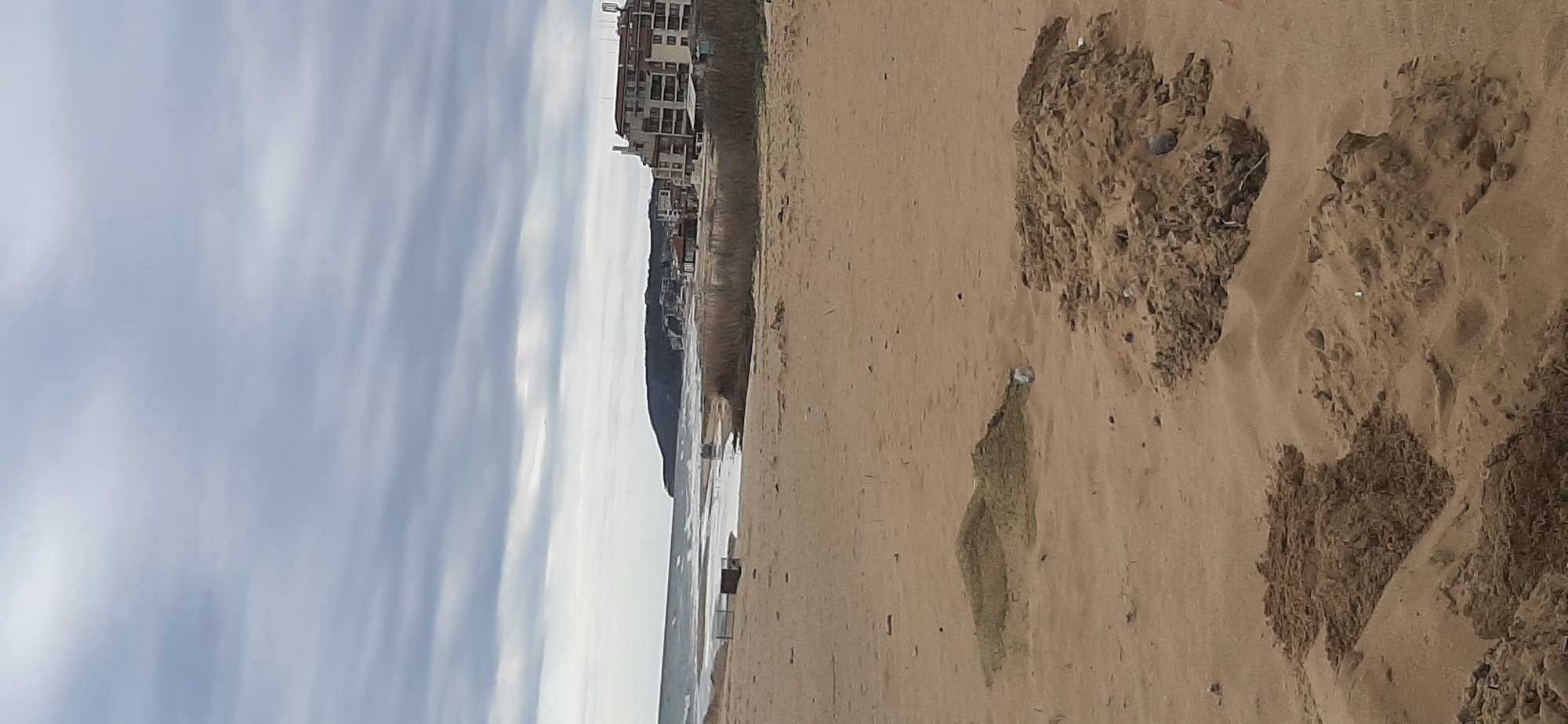beach scene in Byala, Bulgaria. The foreground is composed of sand with clumps of rougher, darker material scattered throughout. To the left of the sand is the sea and a cloudy sky. Buildings are visible on the cliffs above the beach. There are no people visible in the image.