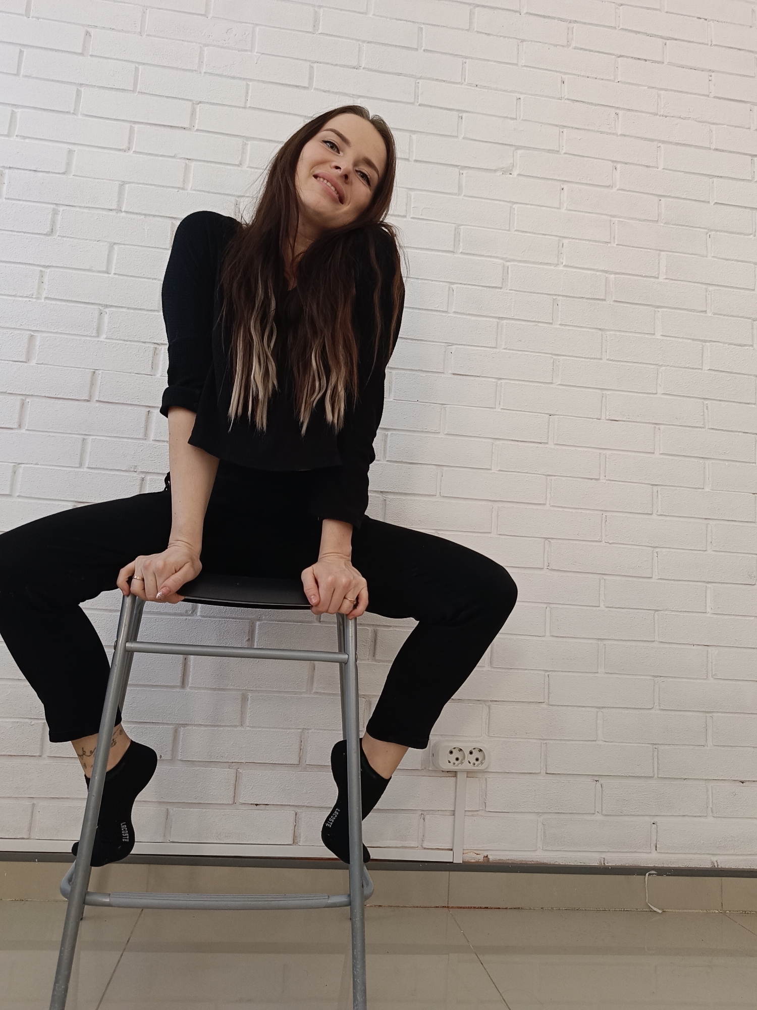 A young woman with long, dark hair and lighter streaks sits on a grey metal stool in front of a white brick wall. She is wearing a black long-sleeved top and black pants, and black socks with the word "Lacoste" visible on them. Her legs are spread, and her hands are resting on the seat of the stool. She is smiling and looking slightly upwards. An electrical outlet is visible on the wall behind her. The location is likely indoors. There is no specific information in the image to confirm it is located in the city of Chaikovsky, Russia.