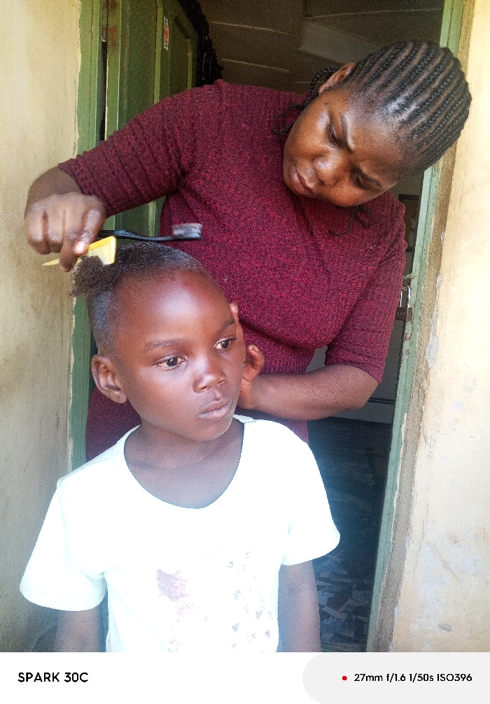 The image displays an indoor scene within a doorway, featuring two individuals. An adult female, of African descent, with cornrowed hair and wearing a dark reddish-brown textured long-sleeved top, is positioned behind a young child, also of African descent, who is wearing a white short-sleeved t-shirt. The female uses her right hand to comb and brush the child's short hair; she holds a yellow plastic comb and a black-handled brush simultaneously, with the comb engaging a section of hair on the child's crown. The child maintains a neutral expression, looking slightly to the viewer's left, with his left hand near his left ear. The background consists of a light beige wall to the left, a green wooden door or door frame behind the adult, which includes a visible metal latch or padlock, and another light beige wall or door frame to the right. The lighting is ambient, illuminating the subjects from the front. The location is an unspecified indoor setting, possibly a residence or small salon in the city of Unknown, Unknown.