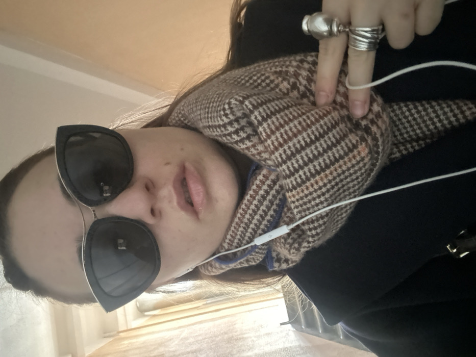 A female subject is depicted in a close-up, slightly upward-angled portrait. She wears large, dark, cat-eye style sunglasses, obscuring her eyes and brows. Her lips are visible, appearing glossy and slightly parted. She has dark hair, likely brown. Her attire includes a dark navy or black coat and a thick, brown and beige houndstooth-patterned scarf. White wired earbuds are in use, with the cable visible across her chest. Her left hand is raised, adorned with a prominent silver-colored, sculpted ring on the index finger and multiple stacked silver-colored bands on the middle finger. The index finger is slightly bent, positioned near the earbud wire. The background is out of focus, showing a diffused light source or window on the left and a plain, light beige wall on the right, consistent with an indoor or enclosed public setting. The scene is stated to be located in Moscow, Russia.