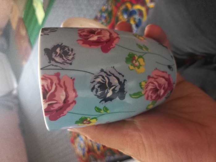 A human right hand, with a light skin tone, holds a light blue ceramic mug from the left side. The mug is decorated with a floral pattern featuring large pink and dark grey roses, interspersed with smaller yellow and green flowers and green stems. A segment of the mug's white handle is visible on the right. In the blurred background, a section of dark grey or blue denim fabric, consistent with clothing, is present in the lower right. To the left and behind the hand, a multicolored textile with distinct red, yellow, and blue patterns is discernible. The scene is an indoor setting in Navbahor, Uzbekistan, with indistinct soft furnishings in the background and a light source originating from the upper right.