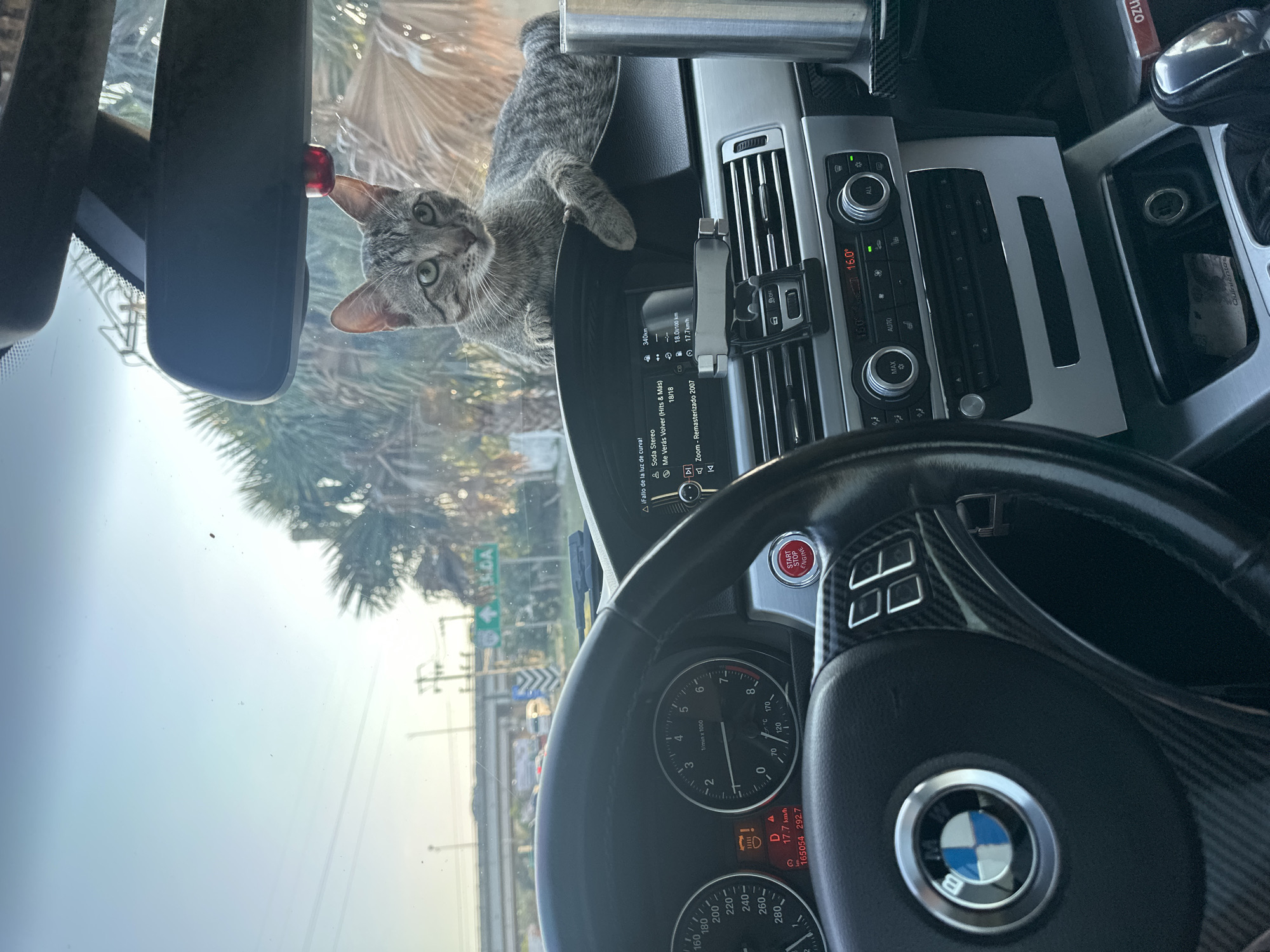A gray tabby cat is perched on the dashboard of a car, looking directly at the camera. The car is a BMW, evident from the logo on the steering wheel and the dashboard's design. The speedometer displays 165054 km, and the car is in drive. The car's infotainment screen shows music playing by Soda Stereo and mentions "Fallo de la luz de curva." Through the windshield, street signs are visible, suggesting an urban environment. The photo likely was taken in Mérida, Mexico, given that the OCR analysis suggests “Fallo de la luz de curva,” a common phrase in the Spanish language. Palm trees are visible in the background.