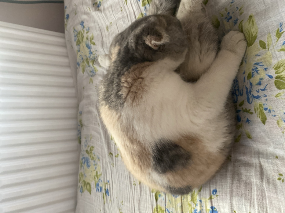 - "A calico cat is curled up on a patterned pillow, its head tucked in and paws extended" by FM-SShF13, licensed under CC BY 4.0