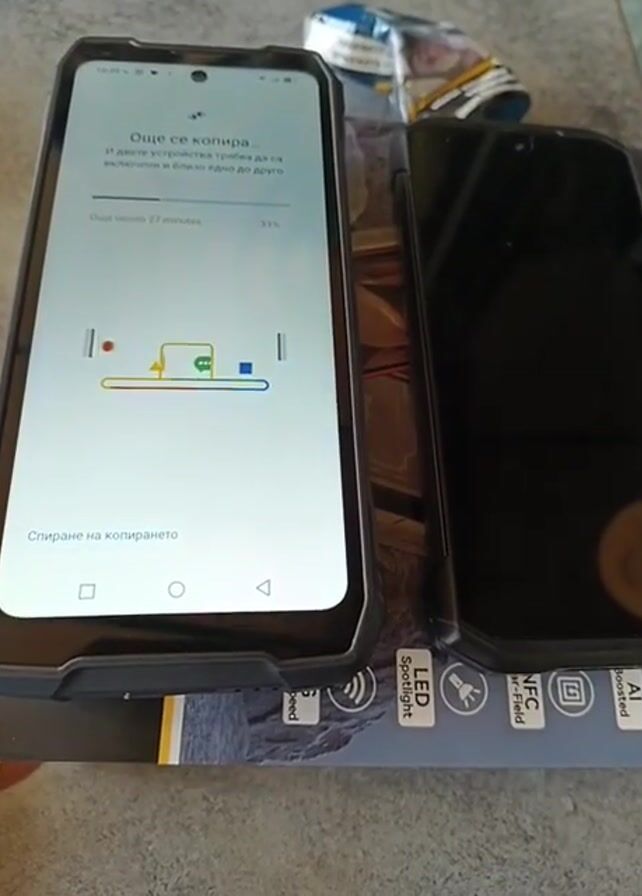 two smartphones on top of a box, with a pack of cigarettes in the background. The screen of the phone on the left displays a data transfer process, indicating it is copying data from another device. The screen says "Oce se kopira" in Bulgarian, which translates to "Still copying," along with a progress bar at 33%. The estimated time remaining is 27 minutes. The phone on the right has a black screen.