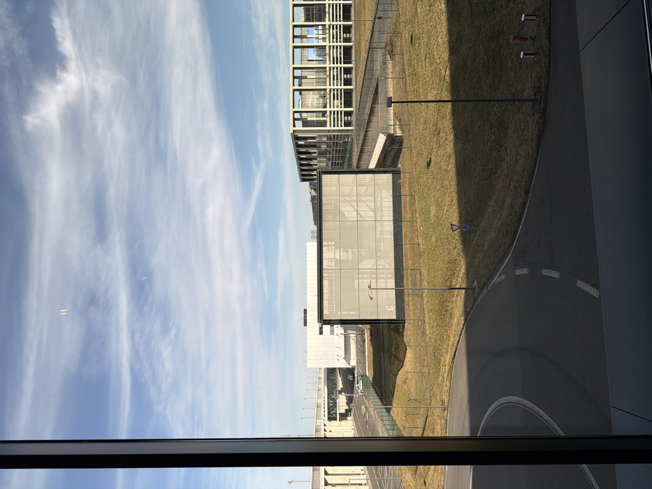 This image depicts an exterior scene observed through a large window, likely within the Berlin Brandenburg Airport (BER) complex in Schönefeld, Germany