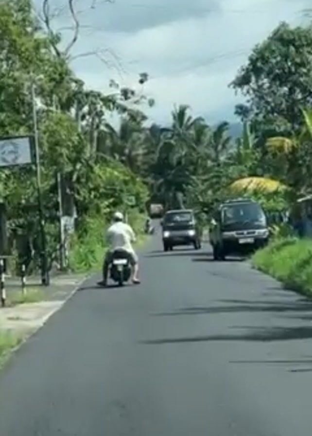 person driving on a paved road in a lush, green, tropical environment, likely in Indonesia
