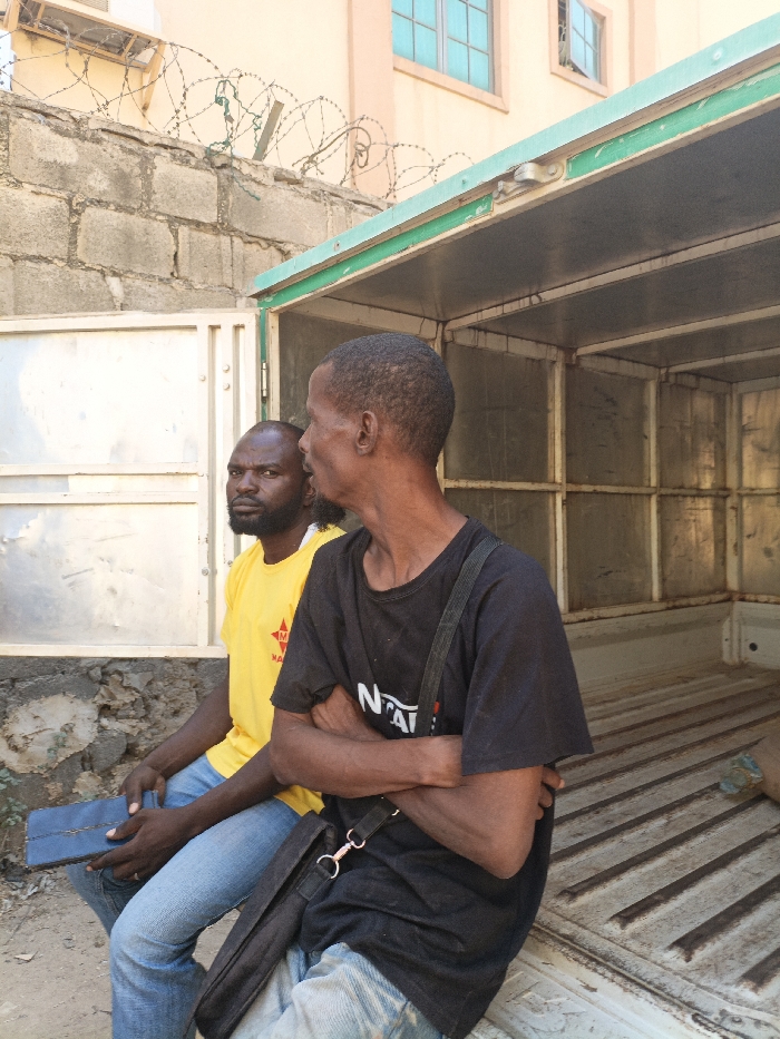 In Fagge A, Nigeria, two adult males are seated on the open cargo bed of a light-colored utility vehicle. The man in the foreground, positioned right of center, wears a black t-shirt with partial white lettering, light blue jeans, and has a dark bag strap across his chest, with arms crossed. He looks toward the left of the frame. The man behind him, to the left, wears a yellow t-shirt with a red logo and blue jeans; he holds a dark blue wallet-like object in his left hand and faces forward. Behind the individuals, a weathered concrete block wall is visible, topped with coiled barbed wire. In the background, a light orange building with two light blue-framed windows is present. The vehicle's cargo bed features metal paneling and a corrugated floor. The ground surface in the immediate vicinity is unpaved dirt.