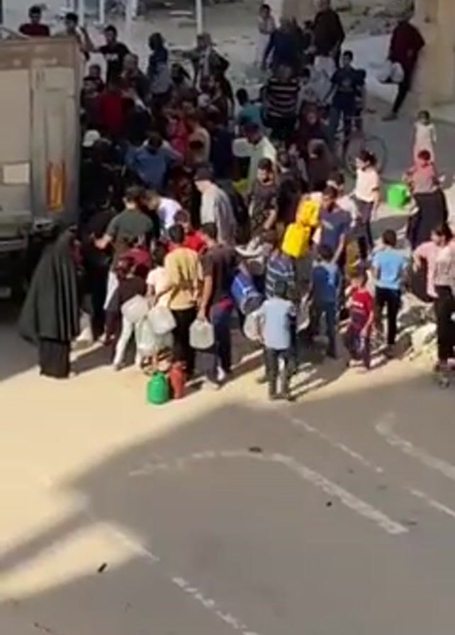 A large group of people are clustered around the back of a white box truck. Many of the people, including children, are holding white plastic jugs. A woman in a black burqa stands at the edge of the crowd. People are seen filling the jugs from the truck. The scene is outdoors on a paved area, with a structure visible in the background. The scene appears to be a relief effort where water is being distributed.