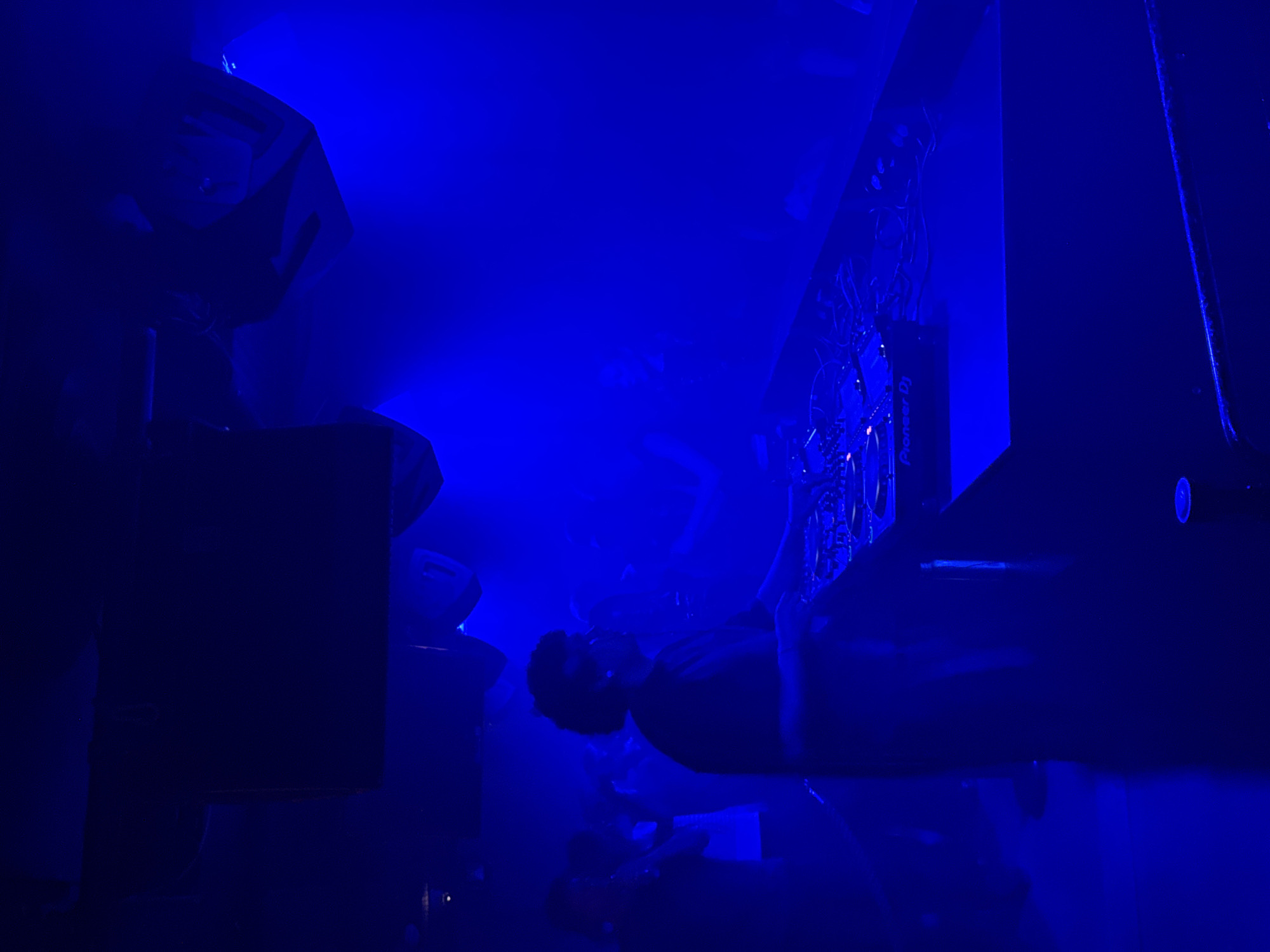 The image depicts an interior scene within a dark music venue or nightclub, saturated with intense blue ambient lighting