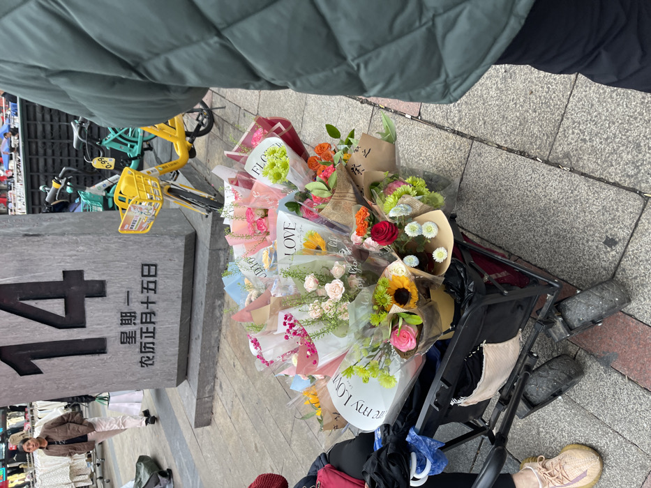 The image captures an outdoor commercial scene in Zhengzhou, China, on Monday, the 15th day of the first lunar month, as indicated by a large grey stone pillar displaying the number "14" and corresponding Chinese characters. In the foreground, a dark, four-wheeled utility wagon is filled with approximately twenty vibrant bouquets of fresh flowers, individually wrapped in various clear plastic, paper, or patterned sleeves, some bearing English text such as "LOVE," "FLOWER," and "Are my LOVE." Flower varieties include red, pink, orange, and peach roses, sunflowers, and white chrysanthemums, among others. To the left, a person's left foot, wearing a tan sneaker, is visible near the wagon. To the right, the lower torso and upper legs of a person in a green quilted puffer jacket are partially visible, standing on the grey tiled pavement. Behind the flower wagon and pillar, several shared bicycles are parked; a prominent yellow bicycle with a front basket displays a "0.99" tag, and a turquoise bicycle is partially visible behind it. The background suggests a retail environment with blurred clothing racks and merchandise.