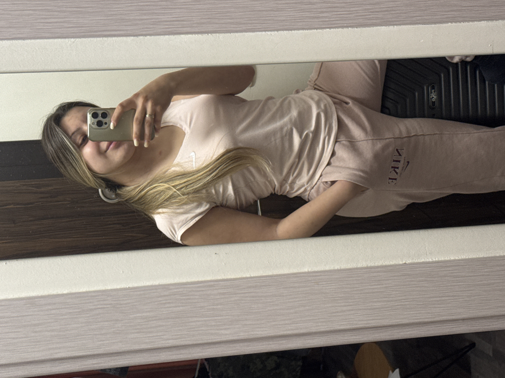 A young woman with long blonde hair, wearing a matching pink t-shirt and Nike sweatpants, is taking a selfie in a mirror