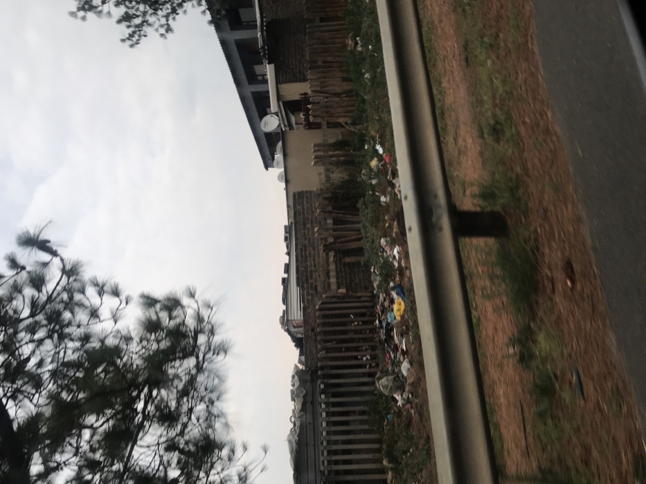 The image depicts a roadside scene in Sandton, South Africa, characterized by an interface between a transportation corridor and a residential area. In the immediate foreground, a dark asphalt road surface is visible, partially obscured by a horizontal, two-bar metal guardrail positioned centrally. The ground behind the guardrail consists of reddish-brown soil mixed with sparse green vegetation, heavily littered with various discarded items including plastic bags, bottles, and general refuse. In the midground, beyond the littered area, a series of fences and structures delineate the property lines. From left to right, these include a vertical fence constructed from closely spaced concrete or wooden posts, followed by a section of dark brick wall, and then a fence made of irregularly spaced vertical wooden planks. Behind these barriers, multiple informal or semi-formal dwellings are visible, constructed from materials such as corrugated metal sheeting and bricks. The background features a larger, more structured building with a dark-colored roof and grey walls, suggesting multiple stories and windows. Numerous white satellite dishes are affixed to the roofs and exterior walls of both the informal structures and the more substantial background building. Overcast, light grey sky dominates the upper portion of the image. The upper-left quadrant is partially obscured by the dark, out-of-focus branches and needles of a pine tree, suggesting the image was captured from a moving vehicle. No individuals are visible within the scene.