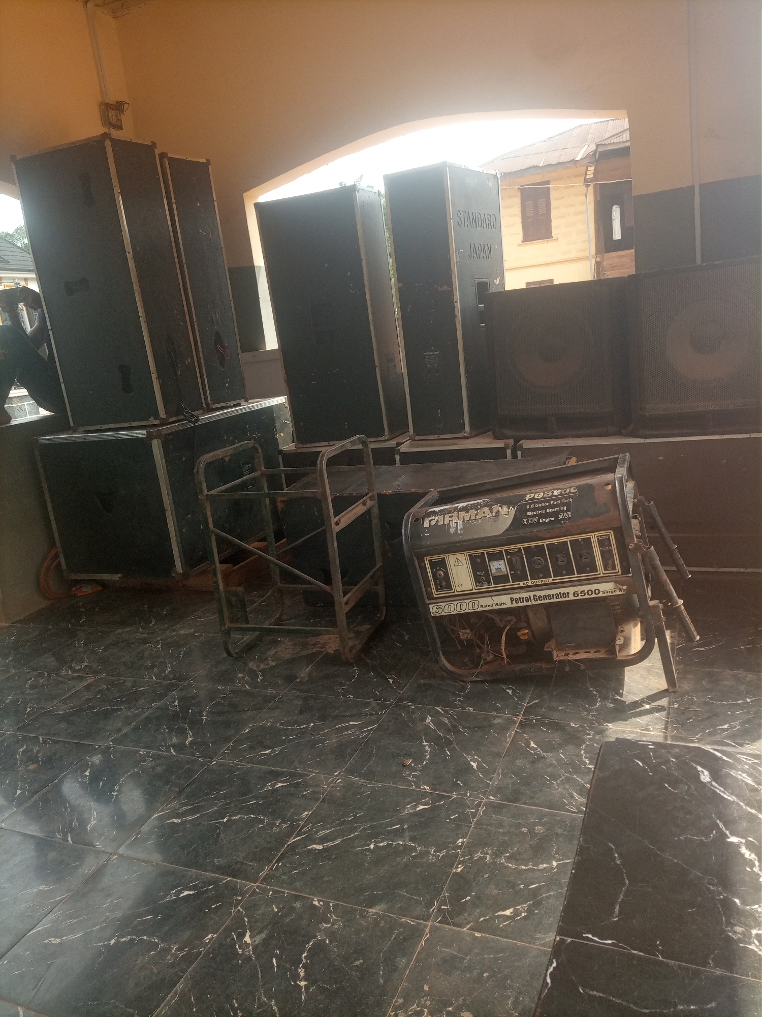 The scene depicts a covered, open-sided area with a dark, marbled tile floor and a light-colored ceiling, located in Alor, Nigeria. Numerous pieces of professional audio equipment and a power generator are stored within the space. On the left, a stack of four large, black rectangular speaker cabinets, the bottom two on caster wheels, are present. In the center, two additional large speaker cabinets are visible, one explicitly labeled "STANDARD JAPAN." Further to the right, several more speaker grilles are discernible. A black and orange "PIFMAN PG6500" petrol generator, rated 6000 watts and indicating a 6.5-gallon fuel tank with electric starting, lies on the tiled floor, showing wear. Adjacent to the generator, a dark-colored metal equipment trolley frame rests. Through an archway in the background, an exterior building with a light-colored facade, dark-shuttered windows, and a corrugated metal roof is visible under a bright sky. A partially obscured, dark figure is visible on the far left behind the speaker stack. The area appears to be a storage or staging location for event equipment.