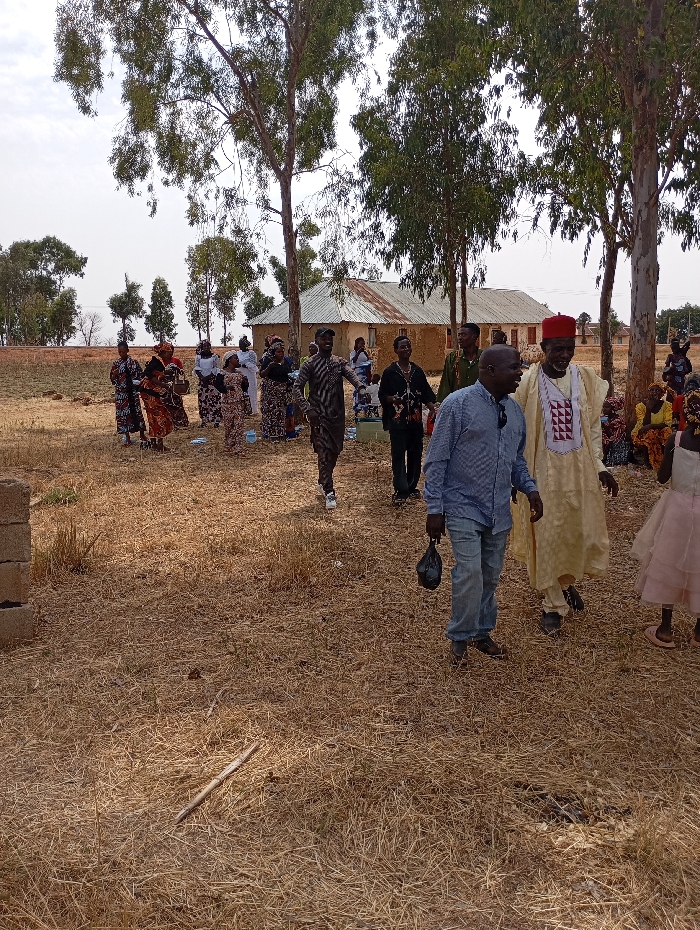 The image depicts an outdoor gathering of approximately twenty-five individuals on dry, golden-brown grass in Pankshin, Nigeria