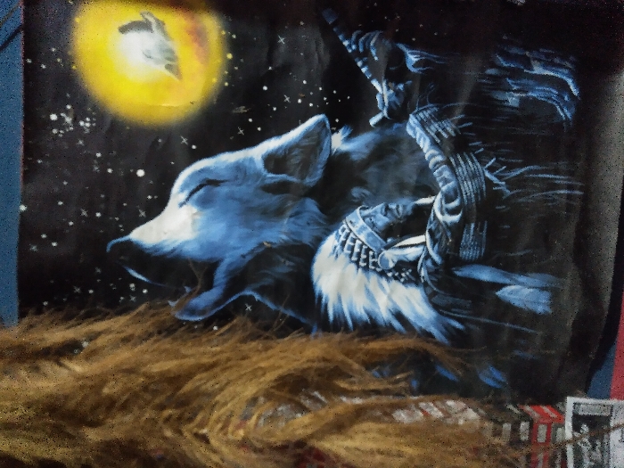 The image displays a fabric tapestry or print situated in Río Grande, Mexico, featuring a nocturnal scene under a starry, dark blue-black sky. Dominantly, a light gray wolf with its head angled upwards howls towards a large, vivid yellow full moon in the upper right, within which a white bird is depicted in flight. Below the wolf, an Indigenous man, shown in profile facing right, wears a white feathered war bonnet and dark traditional attire, holding what appears to be a staff or ceremonial object with both hands. To the left of the tapestry, a dense, vertically oriented mass of light brown, fibrous material, resembling dried palm fronds or raffia, partially obscures the scene. Below this material and slightly to the left, a stack of white and red rectangular objects is partially visible, alongside a small, partially obscured white label or card at the bottom left. A thin red line marks the very bottom edge of the visible area.