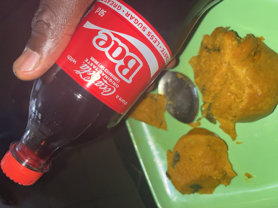 The image, captured in Rido, Nigeria, displays a dark-skinned hand holding a 50cl plastic Coca-Cola bottle with a red screw cap