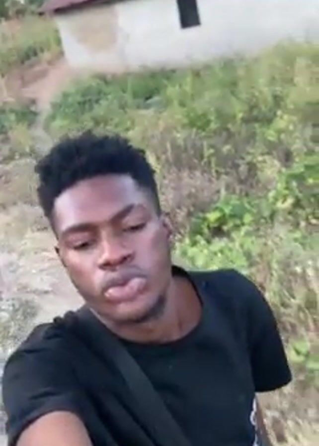 A young Black man is video recording himself from a low angle. He is wearing a black t-shirt and a black bag slung across his shoulder. He is walking on a dirt path with green vegetation on either side. In the background is a white building with a red roof. The man is talking, but the audio is not clear. He appears to be outdoors during daylight.