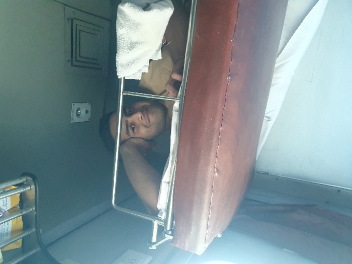The image displays the interior of a train compartment, purportedly located in Sirsala, India. One male individual, with fair complexion and dark hair, is visible. He is positioned on a lower bunk, reclining on his left side, with his head supported by his left hand. His upper torso is partially visible, clad in a light brown garment. He is smiling and looking directly towards the camera. A metal safety railing runs along the edge of the bunk. A white towel is draped over the railing to his right. The bunk itself features a brown padded cushion and white bedding. Above the individual, the grey ceiling of the train car is visible, featuring an overhead storage rack, a square ventilation grate, and a circular ceiling light fixture. The overall environment is consistent with a sleeper train carriage.