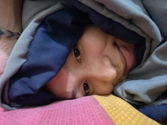 A person is shown lying on a pink and yellow striped bed, covered up to their head with a grey and navy blue blanket. The person is smiling with their tongue slightly out. Their head is tilted at an angle, with dark eyes looking directly into the camera. Only their face, a portion of a striped bedspread, and the blankets are visible in the image.