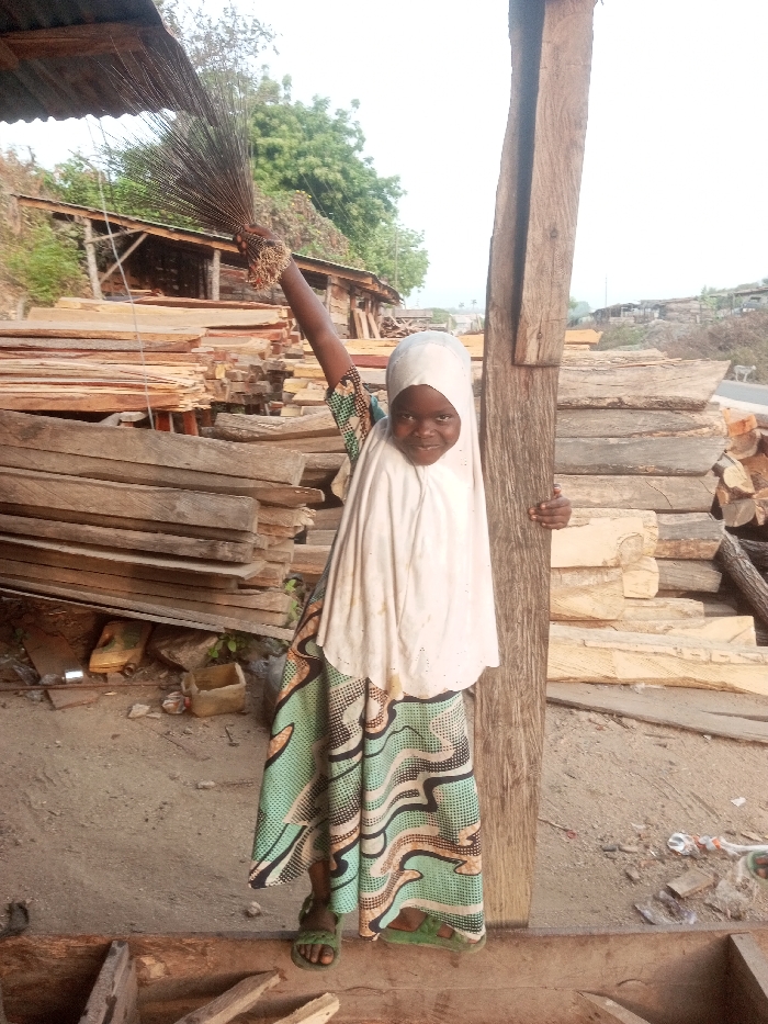 A young girl wearing a light-colored hijab and patterned dress stands amidst stacks of lumber. She holds a bundle of sticks above her head with one arm raised, while the other hand rests on a wooden post. The setting appears to be a woodyard or construction site, with a partly visible structure behind the wood stacks and greenery in the distance. The scene is captured in daylight.