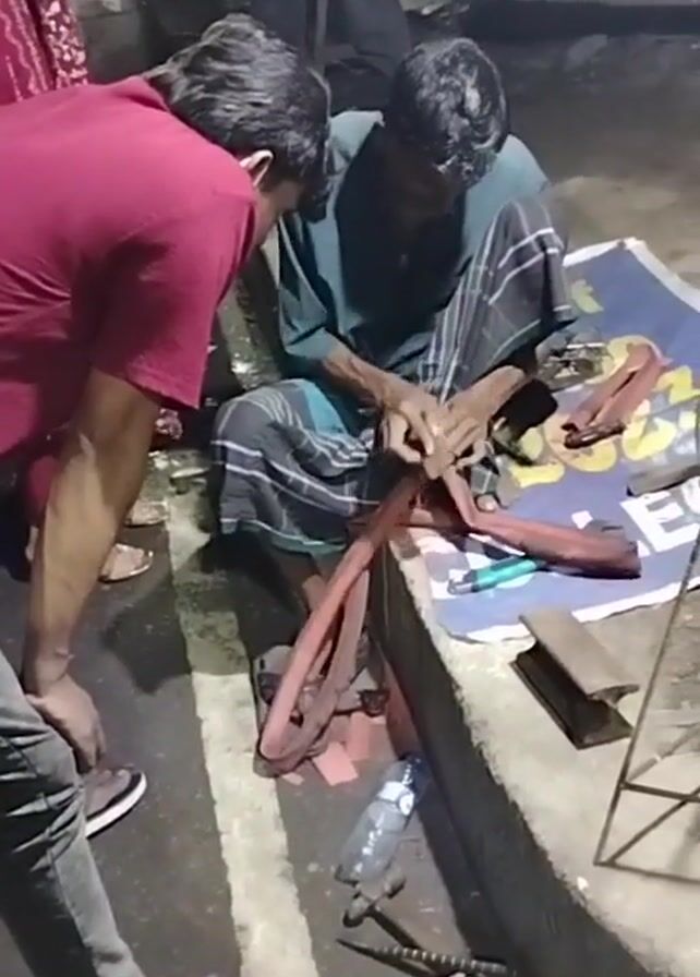 scene at night where three people appear to be observing an older man repairing a bicycle tire inner tube. The man is sitting on a low concrete curb, with his tools and materials spread out on a colorful printed mat in front of him. He is wearing a lungi and a dark shirt. He is actively working on the red inner tube. Two other people are standing close by, watching him. One is wearing a red shirt and jeans, the other is in a gray shirt and jeans. A woman in a patterned dress is standing slightly behind them. There is a water bottle and some other tools scattered on the ground nearby. The area is illuminated by artificial light, suggesting it is nighttime. The setting seems to be along a road or street.