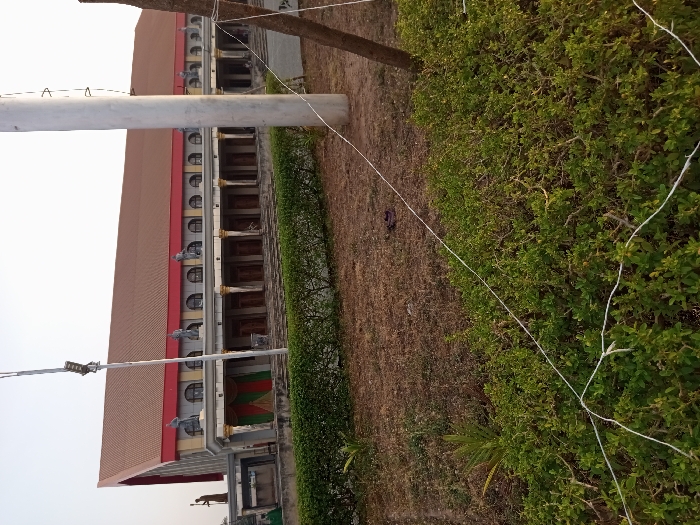 A building with red roof and columns stands beside a green hedge. Part of a pole is on the left side, and a tree trunk is in the foreground. A wire is stretched across the lawn. The environment looks sunny and dry.