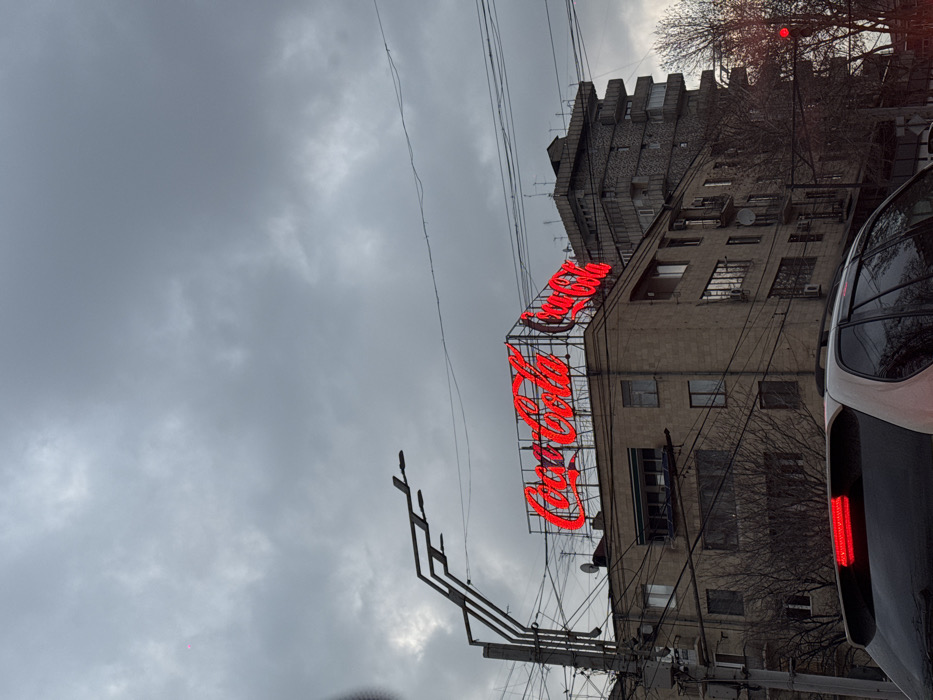 An urban scene in Yerevan, Armenia, is depicted under an overcast, grey sky. A prominent, illuminated red Coca-Cola billboard is situated atop a multi-story, beige-toned residential building. To the immediate right, a taller, darker building of a Brutalist architectural style is visible. In the lower foreground, the rear of a light-colored sport utility vehicle (SUV) displays illuminated red brake lights. A multi-armed street light pole with overhead utility wires crosses the upper-left and central portions of the frame. Bare tree branches are visible on the right, adjacent to a red traffic light.