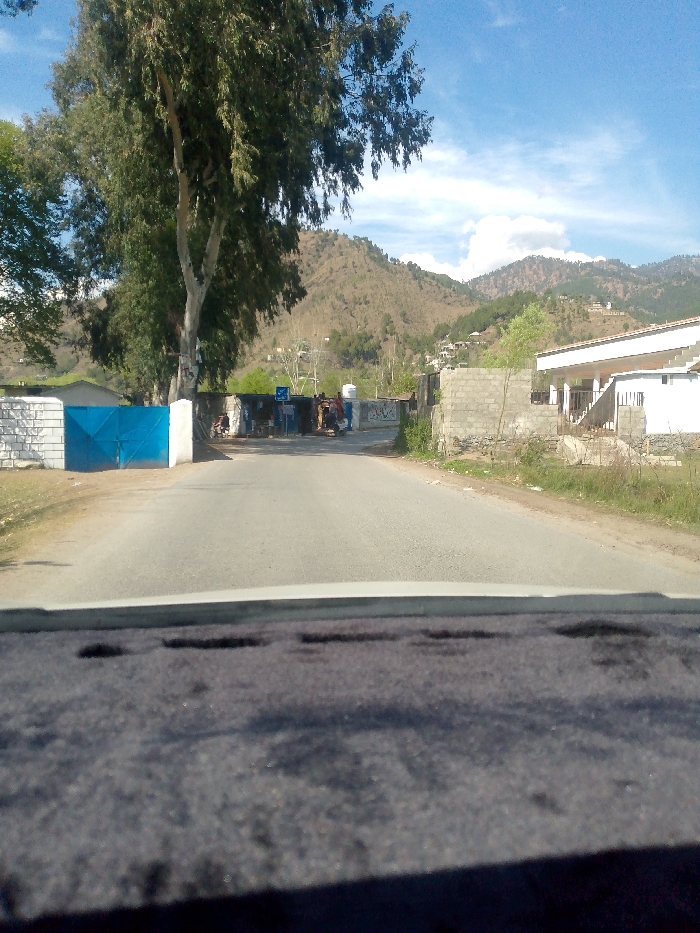 The image depicts a straight asphalt road, viewed from inside a vehicle, in what appears to be a semi-rural area of Janu Mandi, Pakistan, under a clear sky with scattered white clouds. The foreground consists of a dark gray, textured dashboard or vehicle interior. Along the left side of the road, a tall, light-trunked tree with extensive green foliage stands prominently. Beyond the tree, a white brick wall with a large, closed bright blue metal gate is visible. Further down, a cluster of small structures, possibly market stalls or shops, is present. Several individuals are observed in this area, with some appearing to interact or stand near the structures. Parked near these structures are at least two two-wheeled vehicles, possibly motorcycles or auto-rickshaws, and a white cylindrical water tank. A blue and white sign is also visible in this vicinity. On the right side of the road, a low retaining wall constructed from concrete blocks runs parallel to the asphalt. Beyond this wall, patchy dry grass and dirt are present. Further along the road on the right, a white building with a red-tiled roof and an external staircase is visible. The background is dominated by a series of undulating hills, characterized by dry, light brown vegetation and scattered trees. Some isolated structures are discernible on the slopes of these hills.