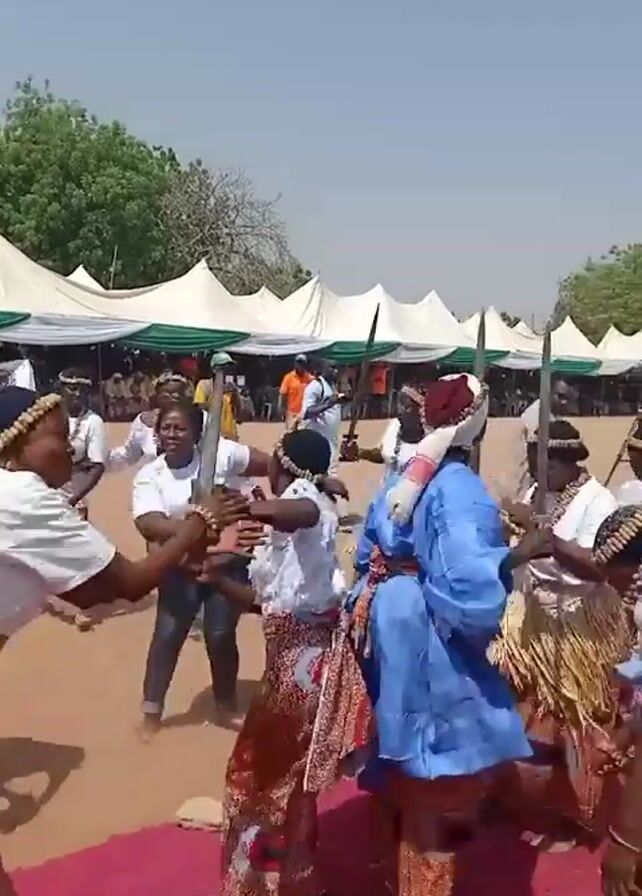 group of people dancing outdoors on a bright day. The dancers appear to be performing a traditional dance; most of them are wearing white shirts and skirts or wraps with colorful patterns. Some are holding objects that look like swords. There are drummers playing various drums in the background. Behind the dancers, a group of spectators is gathered near white tents. In the distance, a cell tower is visible. The ground appears to be dusty. The dance is taking place on a red rug.