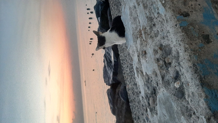 The image captures a coastal scene in Lhokseumawe, Indonesia, during either sunrise or sunset, characterized by soft, low-angle lighting. In the foreground, a bicolored cat, predominantly black on its dorsal side and white on its ventral side, is seated on a weathered, rough concrete or rocky barrier. The cat faces away from the camera, looking towards the sea. The concrete surface exhibits visible aggregate and faint traces of blue paint on its lower edge. Immediately beyond the cat, a line of large, dark rocks forms a natural or artificial breakwater along the shoreline. The calm sea extends into the background, reflecting the gradient hues of the sky. On the water's surface, a small, dark boat or canoe is visible in the mid-distance to the left. To the right, several dark, vertical posts or stumps protrude from the water. Further right in the sea, multiple indistinct dark shapes suggest the presence of other objects or individuals. The sky transitions from a light blue overhead to soft orange, pink, and yellow tones near the horizon, with minimal cloud cover.