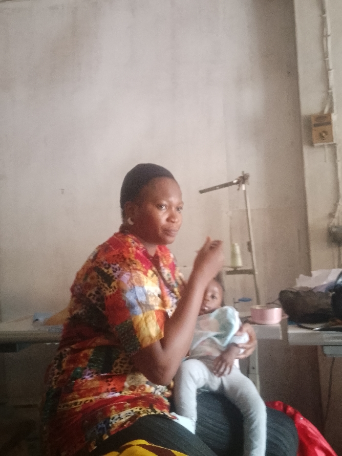 This image depicts an indoor scene in Onitsha, Nigeria, featuring two individuals within what appears to be a work or domestic setting. In the foreground, an adult female with dark skin and short dark hair is seated, facing slightly right and looking away from the camera. She wears a multi-colored, short-sleeved patterned shirt and a white hoop earring in her visible left ear. She is holding an infant or toddler on her lap, positioned between her knees. The adult's right hand is raised to chest level, appearing to manipulate a small, indistinct object or gesture. The infant, dressed in a light-colored top, grey pants, and white socks, is positioned facing forward but looking slightly up and to the adult's right. The background consists of a light-colored, possibly unpainted concrete wall. To the right of the subjects, a workbench or table holds various items: a tall metal stand with a horizontal arm, displaying spools of thread (one light green, one white), a pink plastic bowl, and other indistinct objects. An electrical meter or junction box with exposed conduits is mounted on the wall further to the right. To the left, a light-colored surface or table is partially visible behind the adult.
