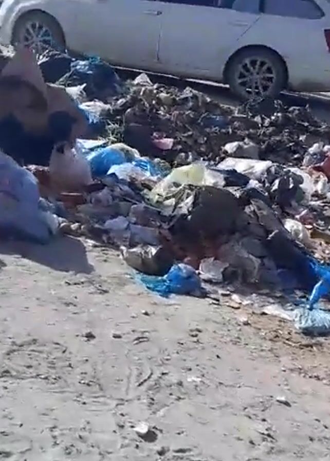 large pile of uncollected garbage on a dirt lot next to a road